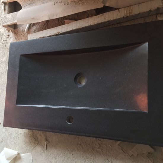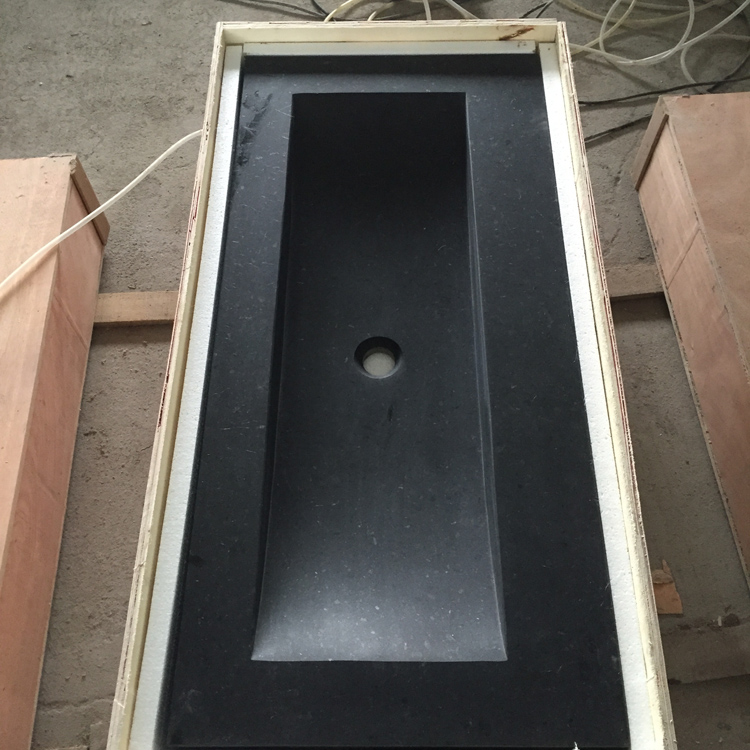 ce bassin basaltique noir carré est fait de granit naturel. il faut beaucoup de technique pour que la forme soit dans les proportions voulues pour que l'eau se passe bien et que le résultat soit superbe. c'est une beauté simple de salle de bains et de la zone de lavage publique.