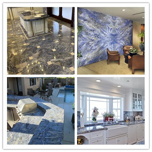 Azul Bahia . Très prisé pour sa couleur bleue, Azul Bahia est le premier choix des consommateurs avertis. Carrière au Brésil, ce matériau exclusif se caractérise par sa couleur bleu marine avec des grappes blanches et des veinures vertes occasionnelles.